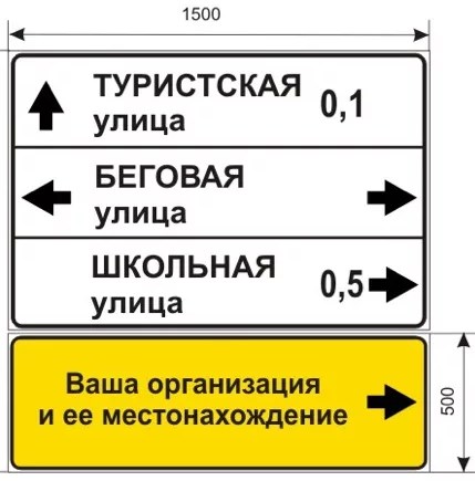 Дорожный указатель – это разновидность дорожного знака, устанавливаемый вдоль дорог, сооружений транспортной инфраструктуры (мостов, транспортных развязок, съездов), представляющий собой металлическое поле, состоящее из трех сегментов с указанием улиц и рекламируемого объекта, установленное на собственной опоре или прикрепленное к мачте светового освещения (фонарному столбу) и содержащее полезную для водителей информацию о наименовании искомого объекта, а также направлении к нему.